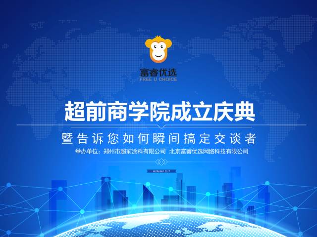 2017年04月19日,超前商學(xué)院成立揭牌啟動(dòng)大會(huì)在鄭州隆重召開,鄭州市超前涂料董事長(zhǎng)、北京富睿優(yōu)選選董事長(zhǎng)—閻運(yùn)鋒,人社部高級(jí)人力資源管理師、WFA國際促動(dòng)師協(xié)會(huì)行動(dòng)學(xué)促動(dòng)師—代志杰,中國智慧策略應(yīng)用專家、企業(yè)運(yùn)營管理專家、飛漲策略(北京)品牌管理有限公司董事長(zhǎng)—董建明等50多位企業(yè)家與公司員工出席本次活動(dòng)。